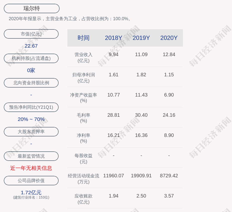 2020年年报显示,瑞尔特的主营业务为工业,占营收比例为:100.0%。