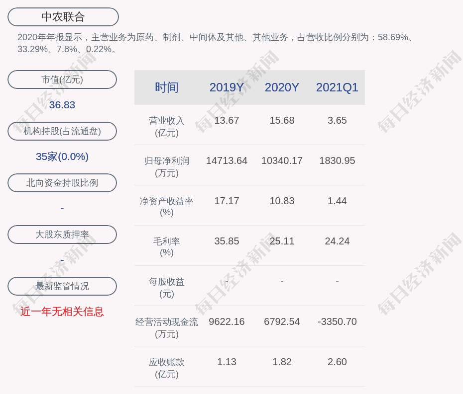 2020年年报显示,中农联合的主营业务为原药、制剂、中间体及其他、其他业务,占营收比例分别为:58.69%、33.29%、7.8%、0.22%。