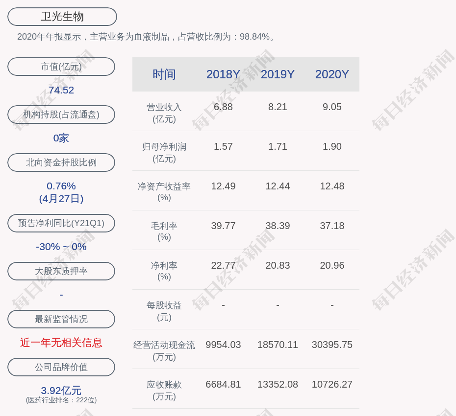 2020年年报显示,卫光生物的主营业务为血液制品,占营收比例为:98.84%。