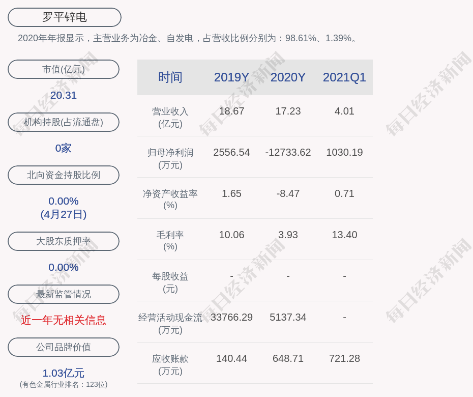 2020年年报显示,罗平锌电的主营业务为冶金、自发电,占营收比例分别为:98.61%、1.39%。