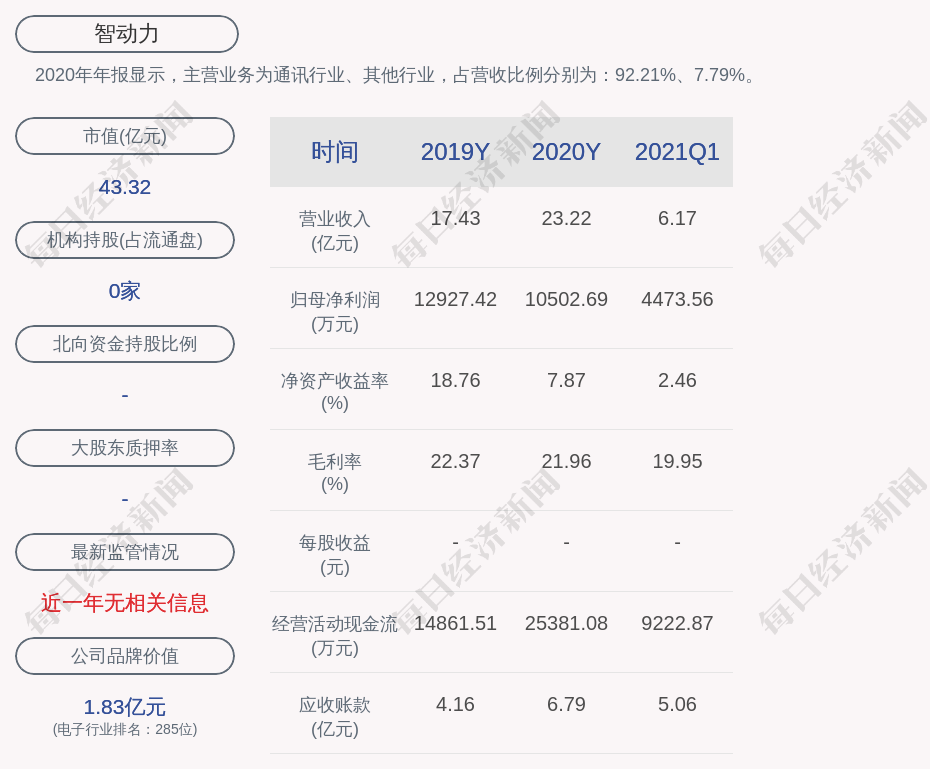 2020年年报显示,智动力的主营业务为通讯行业、其他行业,占营收比例分别为:92.21%、7.79%。