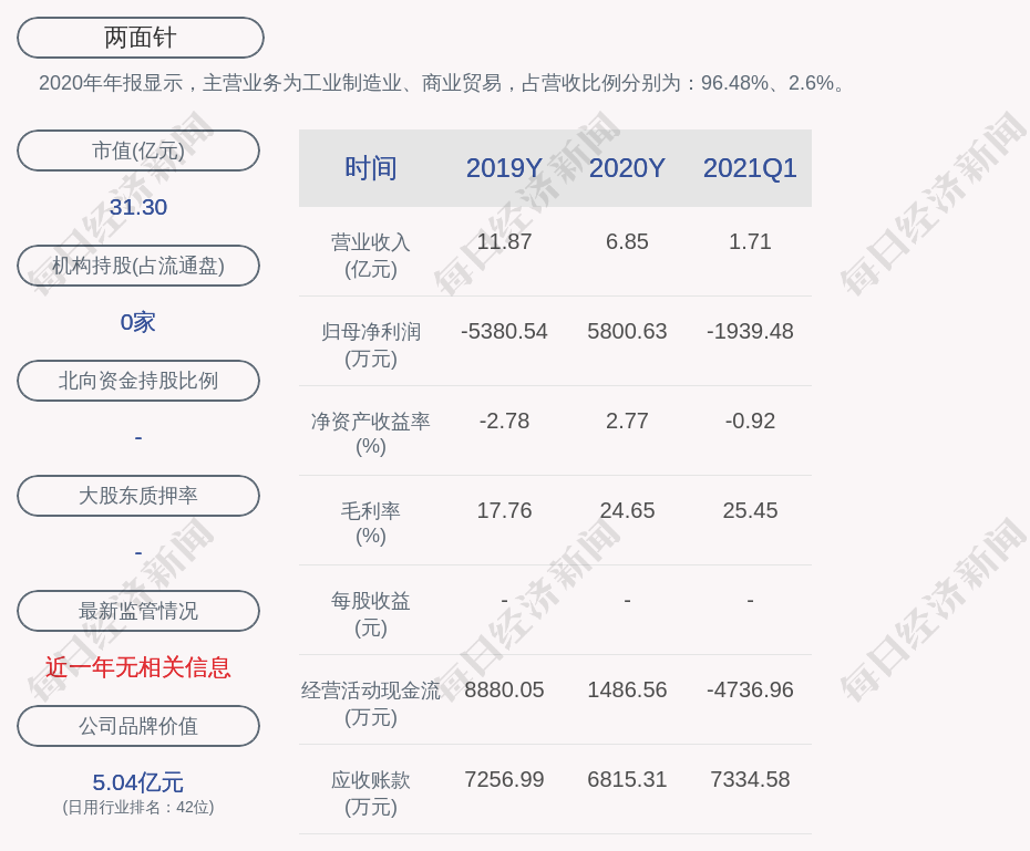 每经AI快讯,两面针(SH 600249,收盘价:5.69元)4月28日晚间发布一季度业绩公告称,2021年第一季度营收约1.71亿元,同比增长24.72%;净亏损约1939万元;基本每股收益-0.04元。