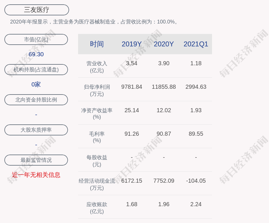 2020年年报显示,三友医疗的主营业务为医疗器械制造业,占营收比例为:100.0%。