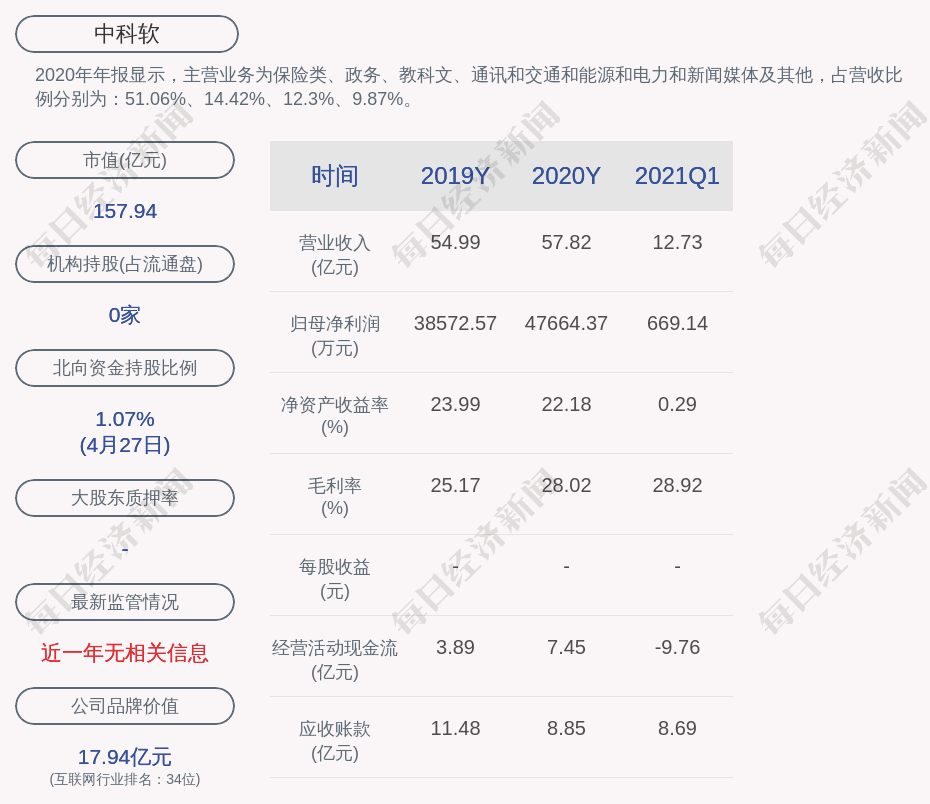 2020年年报显示,中科软的主营业务为保险类、政务、教科文、通讯和交通和能源和电力和新闻媒体及其他,占营收比例分别为:51.06%、14.42%、12.3%、9.87%。