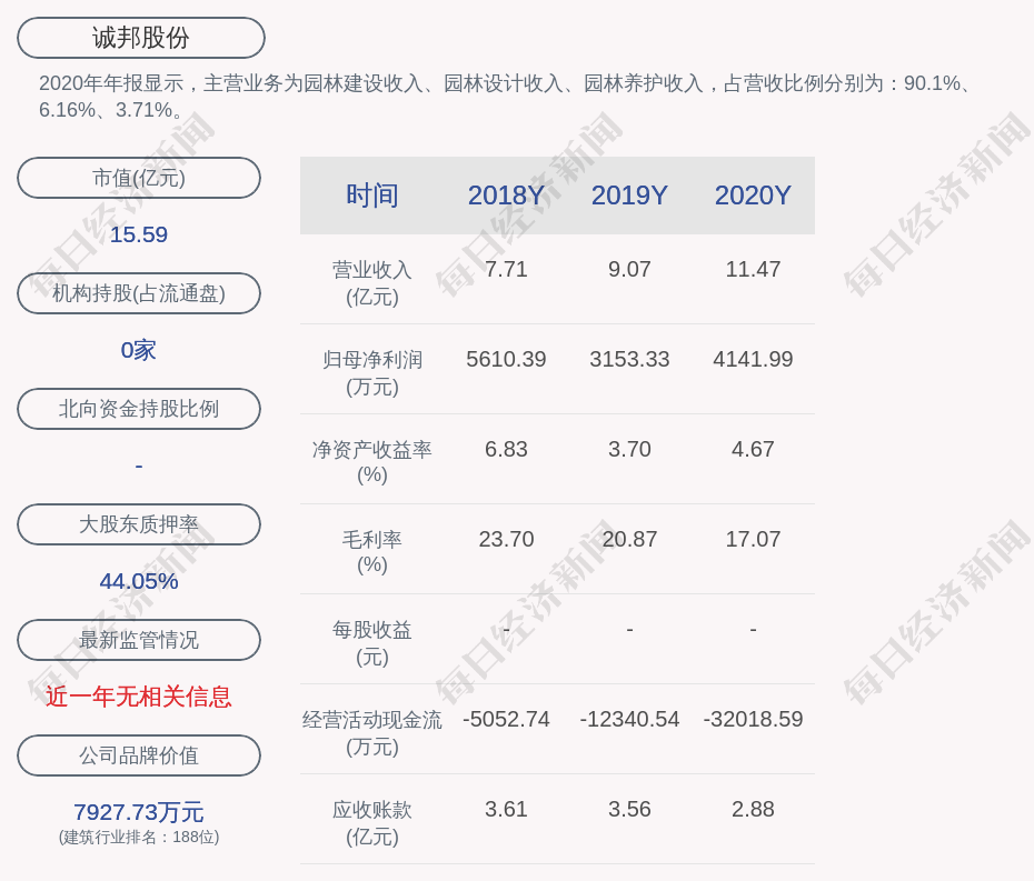 2020年年报显示,诚邦股份的主营业务为园林建设收入、园林设计收入、园林养护收入,占营收比例分别为:90.1%、6.16%、3.71%。