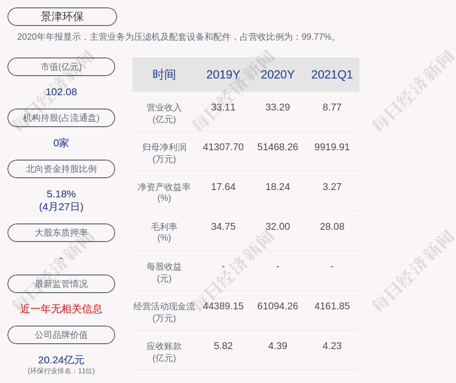 2020年年报显示,景津环保的主营业务为压滤机及配套设备和配件,占营收比例为:99.77%。