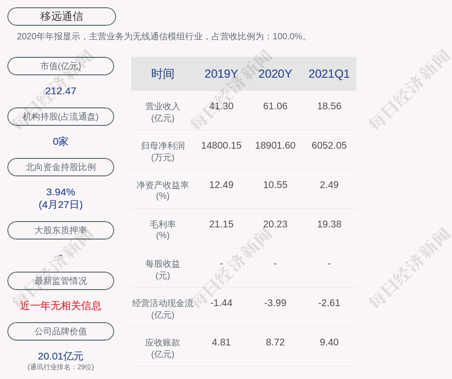 2020年年报显示,移远通信的主营业务为无线通信模组行业,占营收比例为:100.0%。