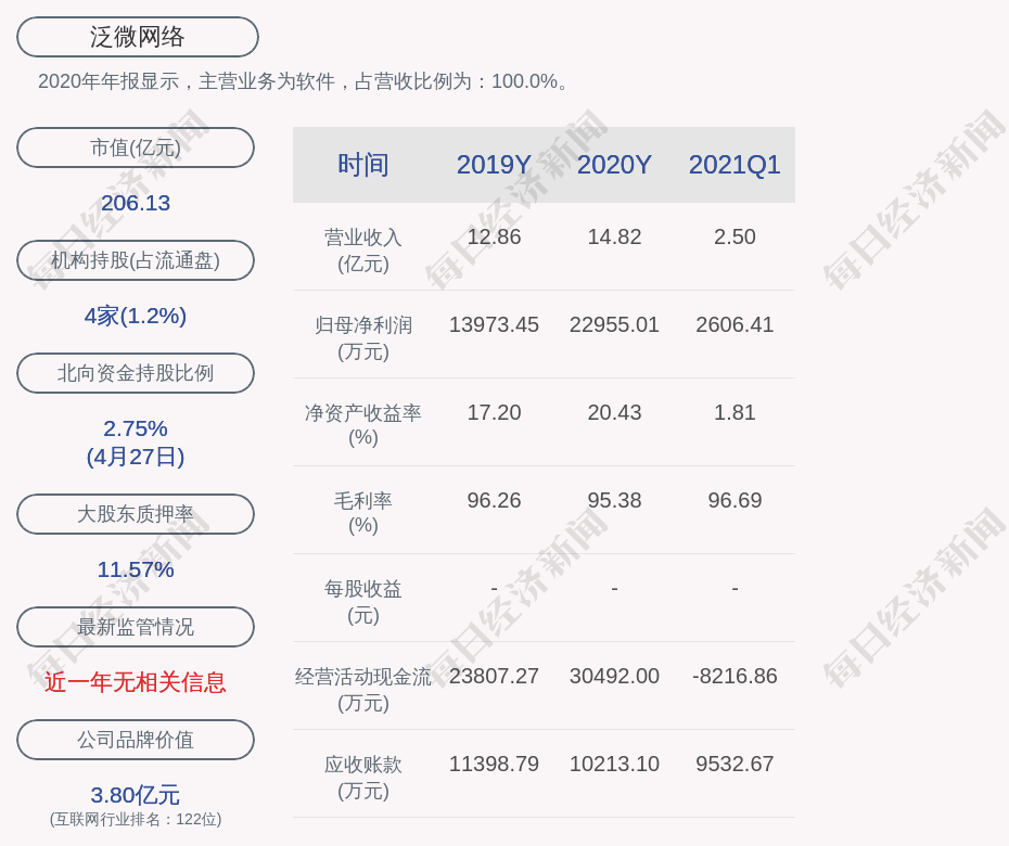 2020年年报显示,泛微网络的主营业务为软件,占营收比例为:100.0%。