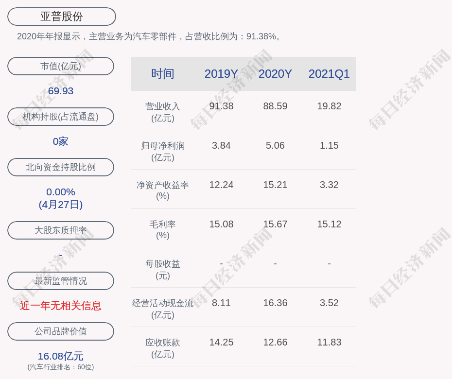 2020年年报显示,亚普股份的主营业务为汽车零部件,占营收比例为:91.38%。
