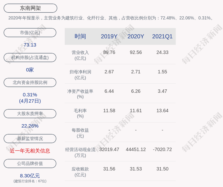 2020年年报显示,东南网架的主营业务为建筑行业、化纤行业、其他,占营收比例分别为:72.48%、22.06%、0.31%。