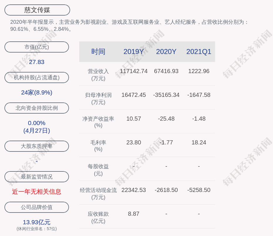 2020年半年报显示,慈文传媒的主营业务为影视剧业、游戏及互联网服务业、艺人经纪服务,占营收比例分别为:90.61%、6.55%、2.84%。