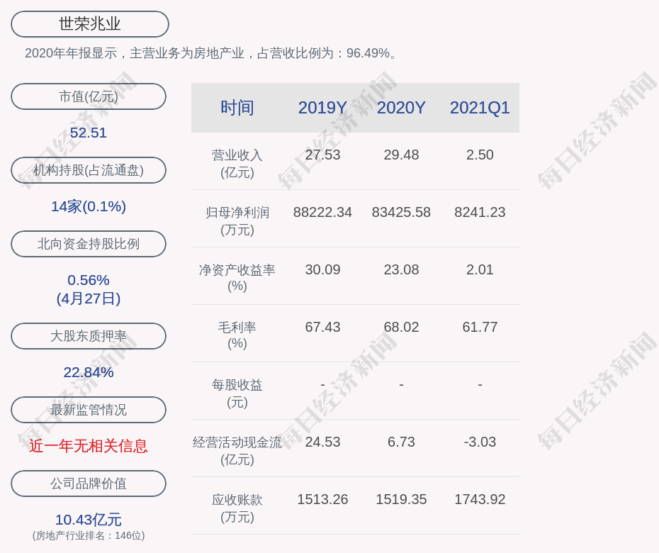 2020年年报显示,世荣兆业的主营业务为房地产业,占营收比例为:96.49%。