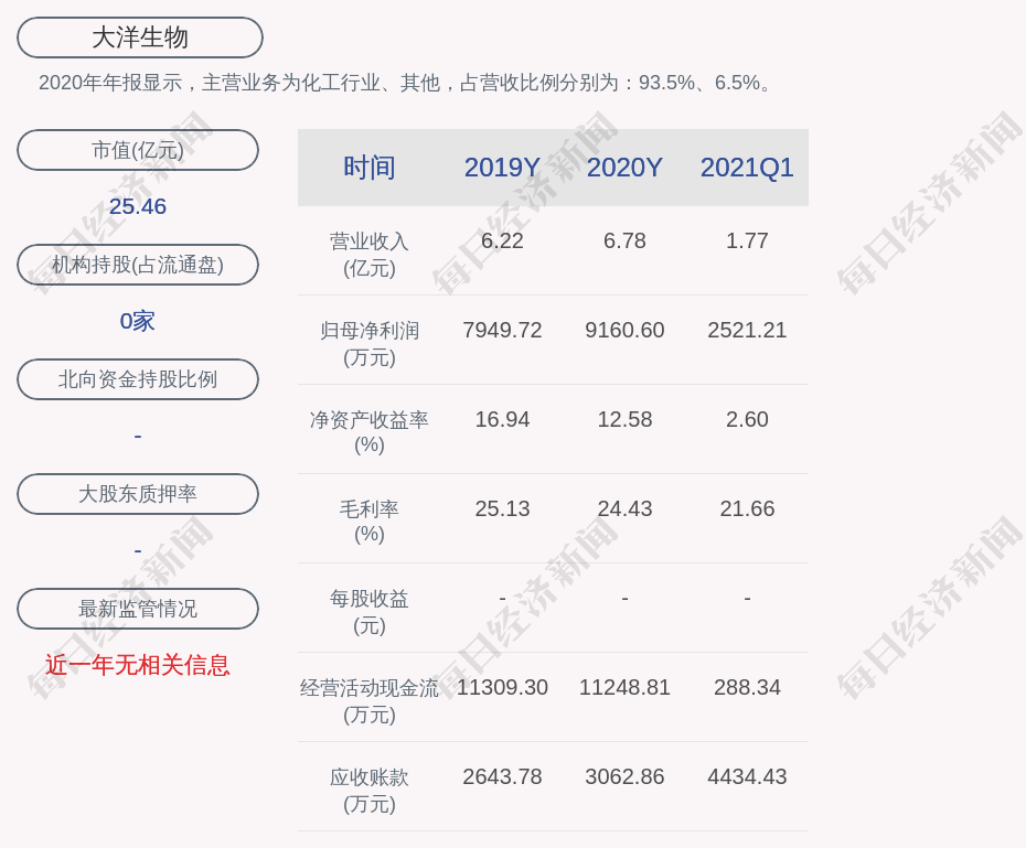 2020年年报显示,大洋生物的主营业务为化工行业、其他,占营收比例分别为:93.5%、6.5%。