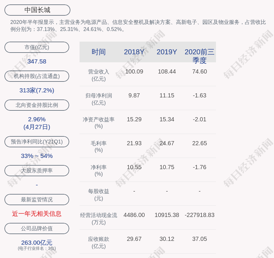 2020年半年报显示,中国长城的主营业务为电源产品、信息安全整机及解决方案、高新电子、园区及物业服务,占营收比例分别为:37.13%、25.31%、24.61%、0.52%。