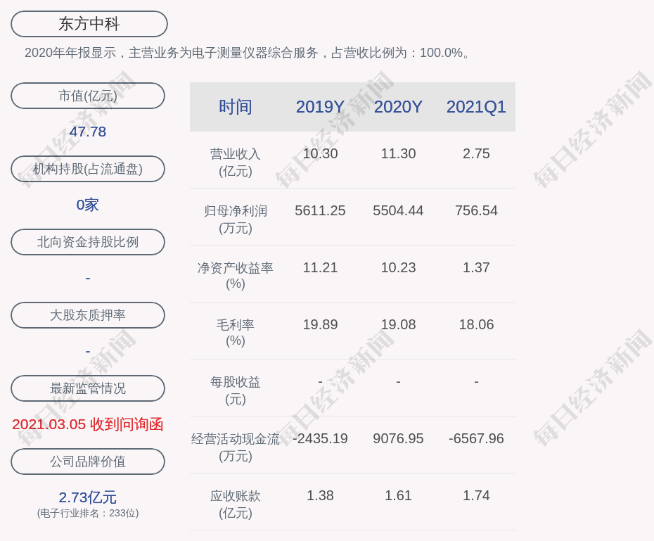 2020年年报显示,东方中科的主营业务为电子测量仪器综合服务,占营收比例为:100.0%。