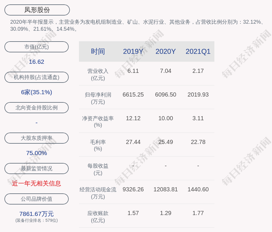 2020年半年报显示,凤形股份的主营业务为发电机组制造业、矿山、水泥行业、其他业务,占营收比例分别为:32.12%、30.09%、21.61%、14.54%。