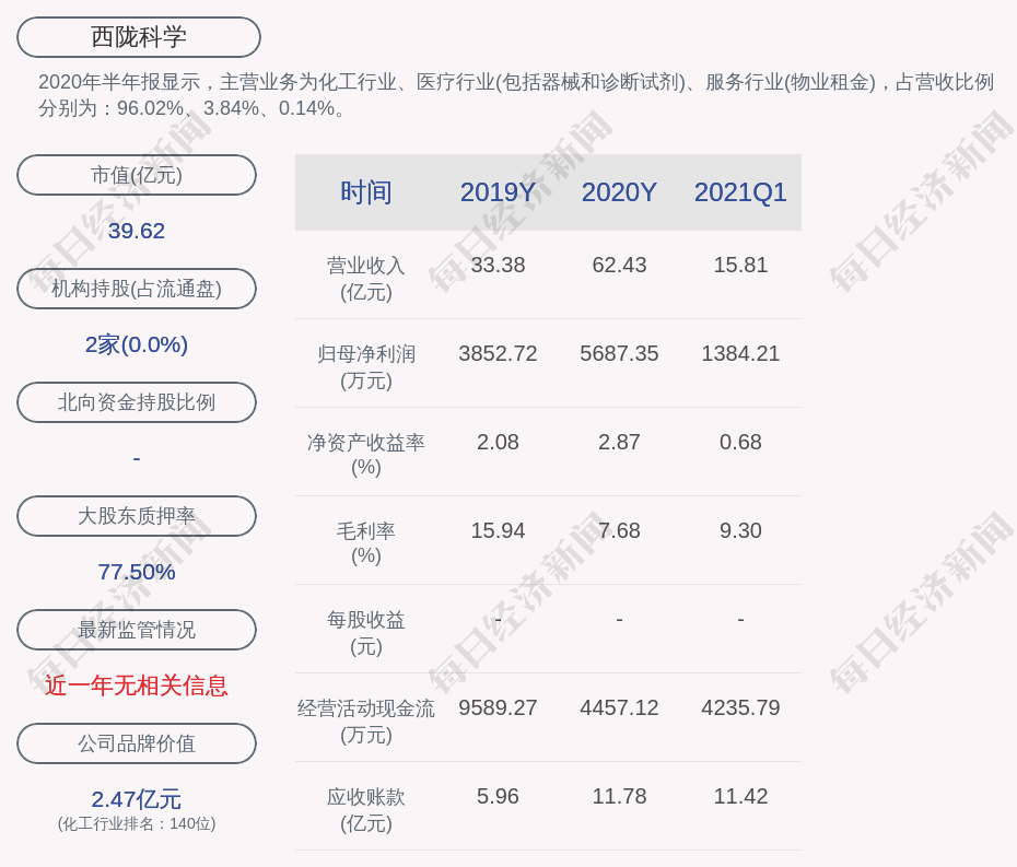 2020年半年报显示,西陇科学的主营业务为化工行业、医疗行业(包括器械和诊断试剂)、服务行业(物业租金),占营收比例分别为:96.02%、3.84%、0.14%。