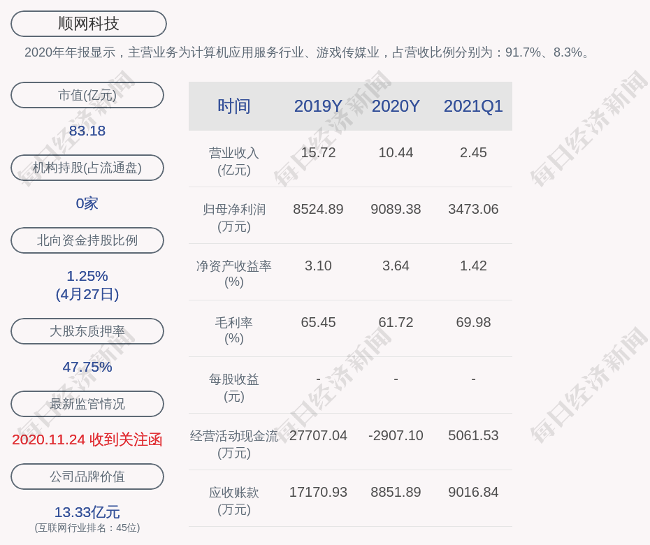 2020年年报显示,顺网科技的主营业务为计算机应用服务行业、游戏传媒业,占营收比例分别为:91.7%、8.3%。