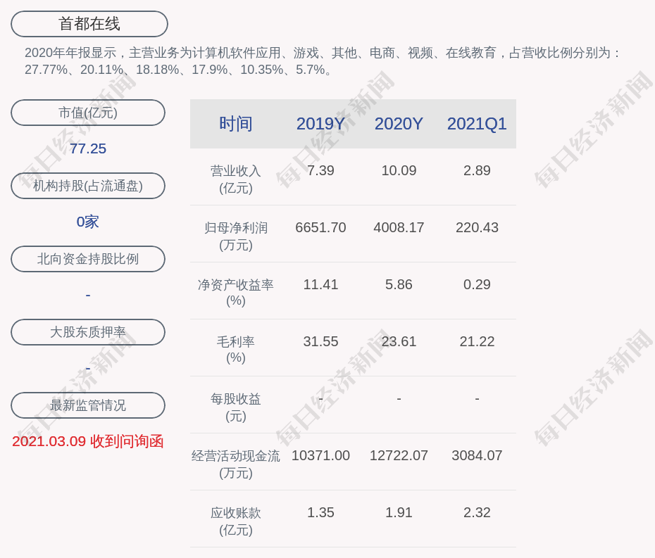 2020年年报显示,首都在线的主营业务为计算机软件应用、游戏、其他、电商、视频、在线教育,占营收比例分别为:27.77%、20.11%、18.18%、17.9%、10.35%、5.7%。