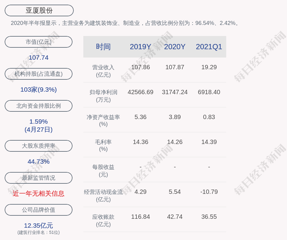 2020年半年报显示,亚厦股份的主营业务为建筑装饰业、制造业,占营收比例分别为:96.54%、2.42%。