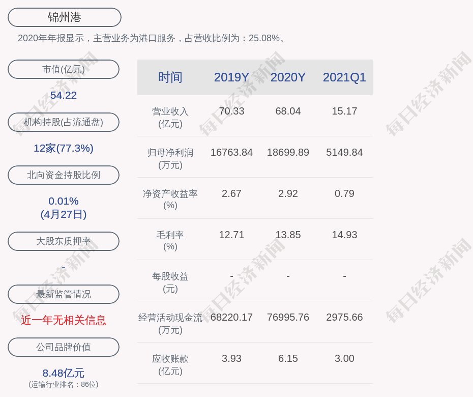 2020年年报显示,锦州港的主营业务为港口服务,占营收比例为:25.08%。