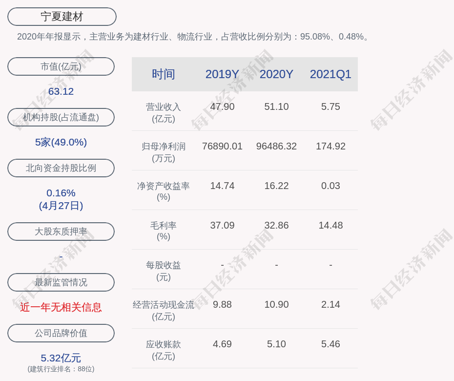 2020年年报显示,宁夏建材的主营业务为建材行业、物流行业,占营收比例分别为:95.08%、0.48%。