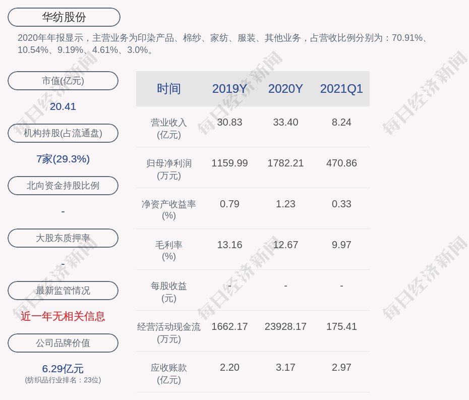 2020年年报显示,华纺股份的主营业务为印染产品、棉纱、家纺、服装、其他业务,占营收比例分别为:70.91%、10.54%、9.19%、4.61%、3.0%。