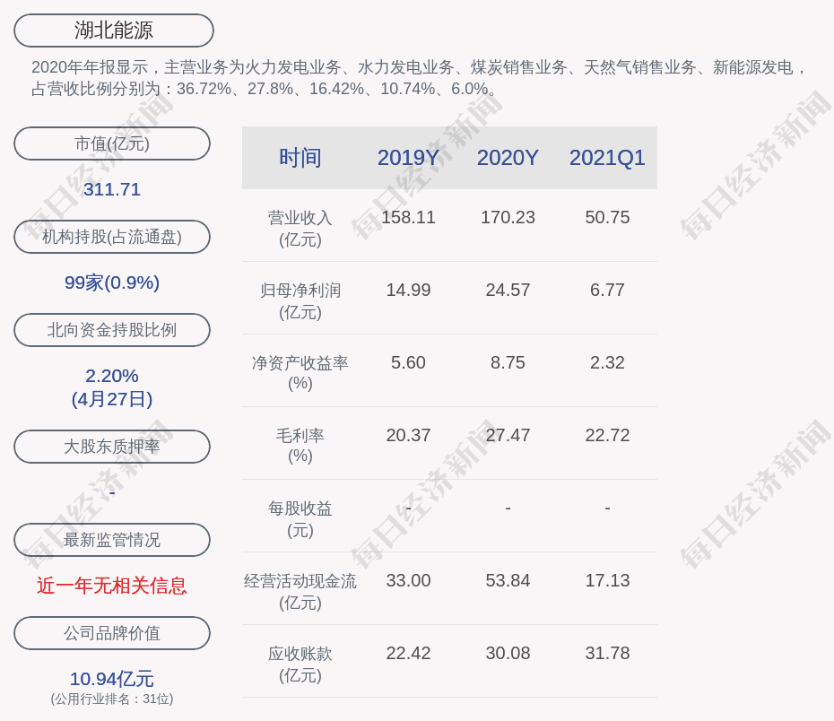 2020年年报显示,湖北能源的主营业务为火力发电业务、水力发电业务、煤炭销售业务、天然气销售业务、新能源发电,占营收比例分别为:36.72%、27.8%、16.42%、10.74%、6.0%。