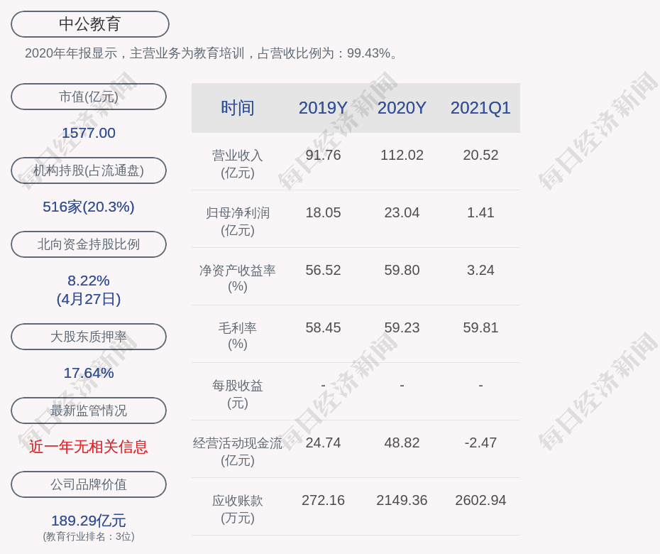 2020年年报显示,中公教育的主营业务为教育培训,占营收比例为:99.43%。