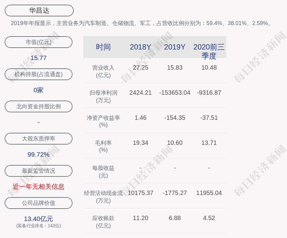 2019年年报显示,华昌达的主营业务为汽车制造、仓储物流、军工,占营收比例分别为:59.4%、38.01%、2.59%。