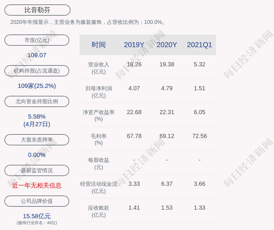 2020年年报显示,比音勒芬的主营业务为服装服饰,占营收比例为:100.0%。
