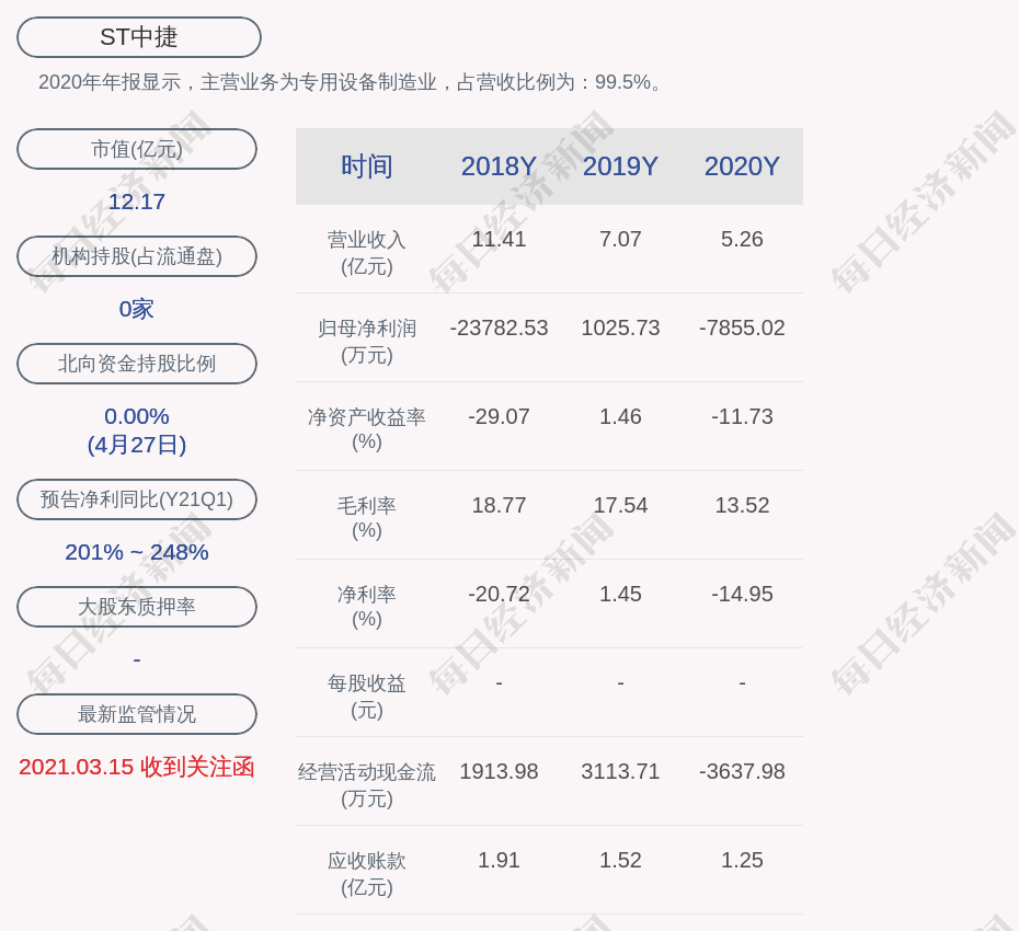 2020年年报显示,ST中捷的主营业务为专用设备制造业,占营收比例为:99.5%。