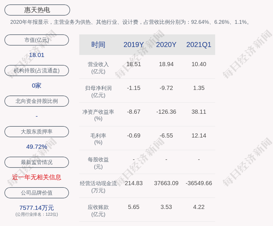 2020年年报显示,惠天热电的主营业务为供热、其他行业、设计费,占营收比例分别为:92.64%、6.26%、1.1%。