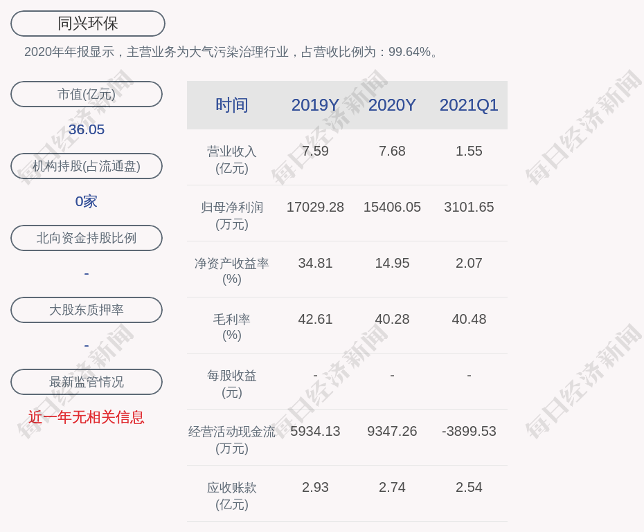 2020年年报显示,同兴环保的主营业务为大气污染治理行业,占营收比例为:99.64%。