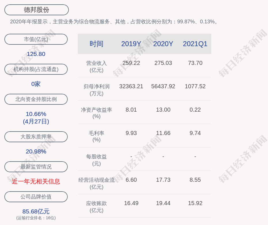 2020年年报显示,德邦股份的主营业务为综合物流服务、其他,占营收比例分别为:99.87%、0.13%。