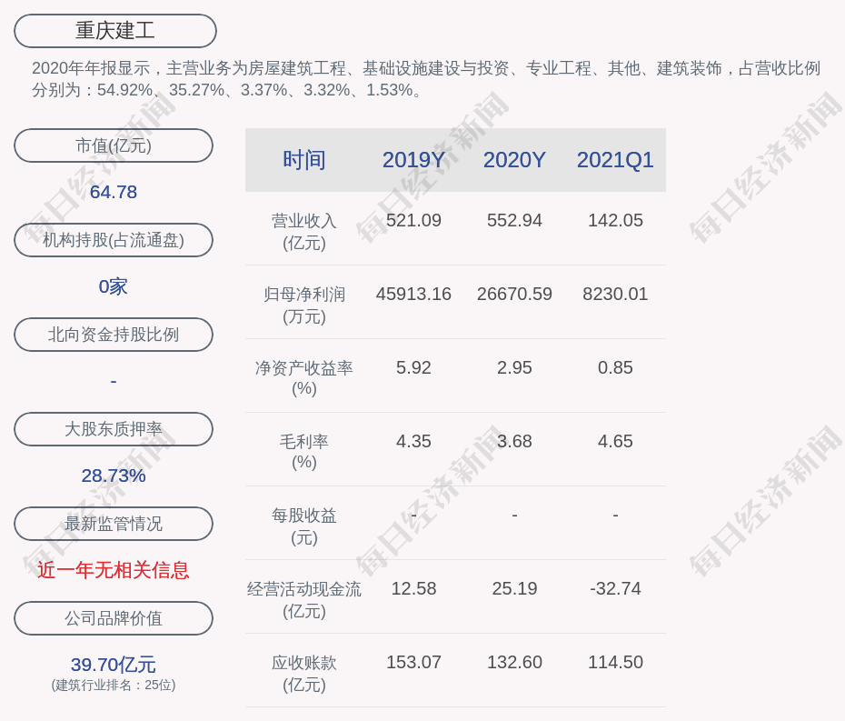 2020年年报显示,重庆建工的主营业务为房屋建筑工程、基础设施建设与投资、专业工程、其他、建筑装饰,占营收比例分别为:54.92%、35.27%、3.37%、3.32%、1.53%。