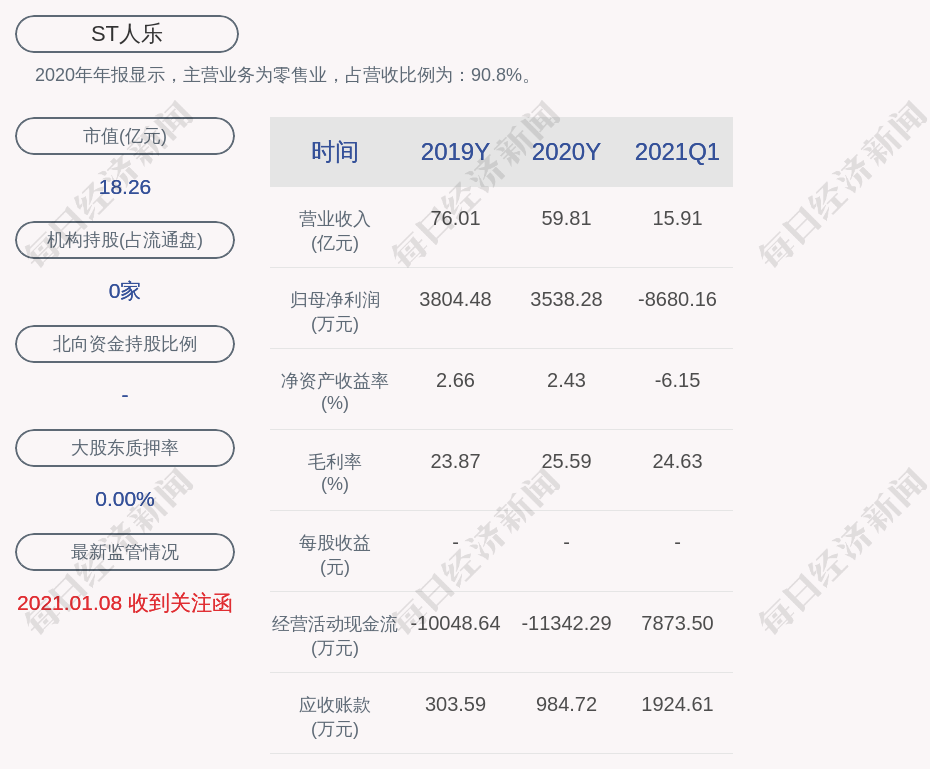 2020年年报显示,ST人乐的主营业务为零售业,占营收比例为:90.8%。