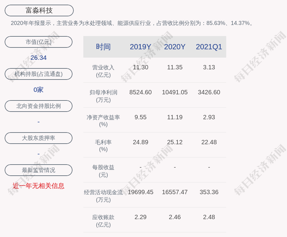 2020年年报显示,富淼科技的主营业务为水处理领域、能源供应行业,占营收比例分别为:85.63%、14.37%。