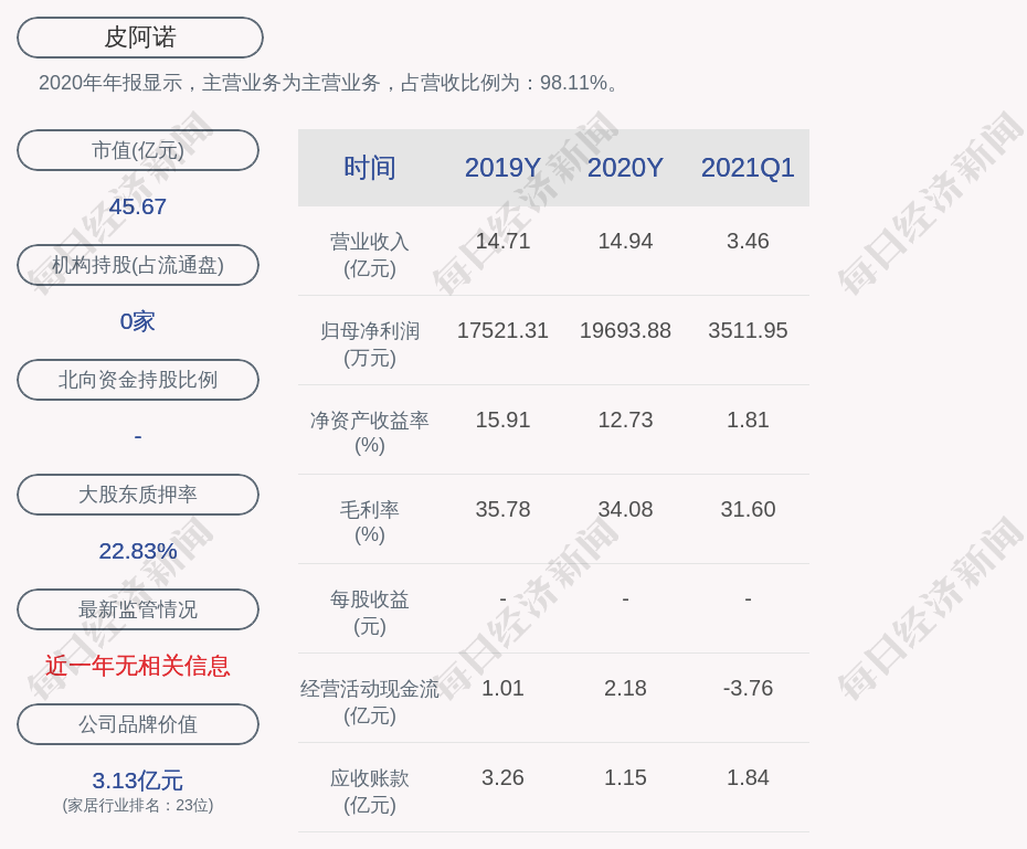 2020年年报显示,皮阿诺的主营业务为主营业务,占营收比例为:98.11%。