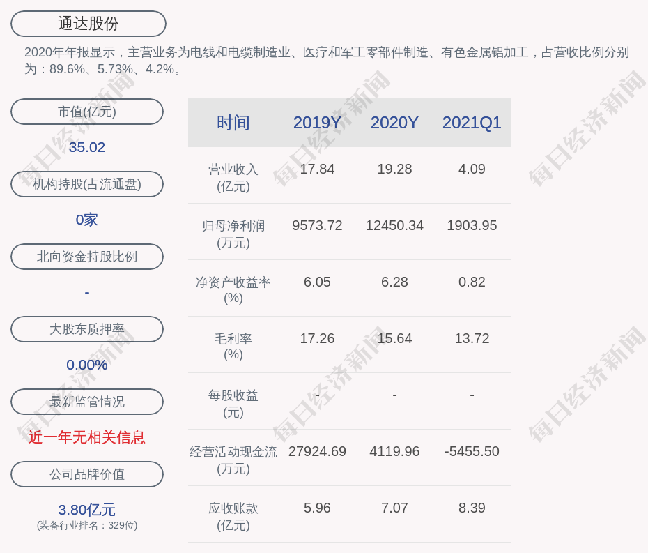 2020年年报显示,通达股份的主营业务为电线和电缆制造业、医疗和军工零部件制造、有色金属铝加工,占营收比例分别为:89.6%、5.73%、4.2%。