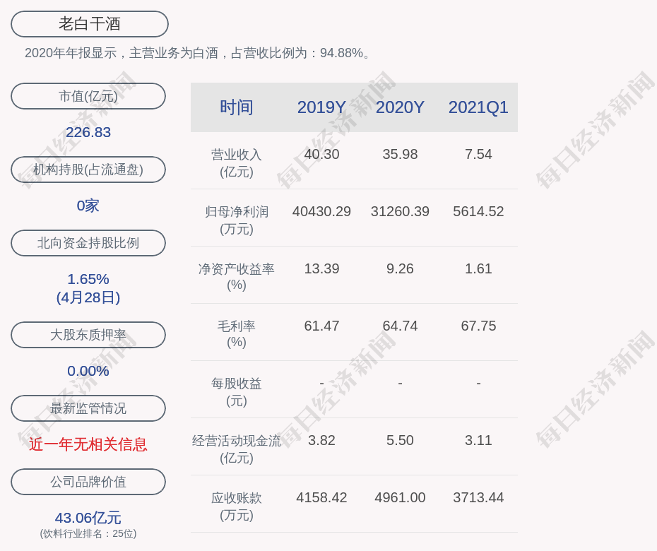 2020年年报显示,老白干酒的主营业务为白酒,占营收比例为:94.88%。