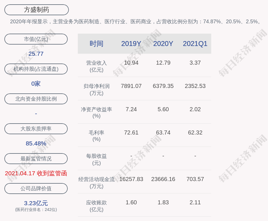 2020年年报显示,方盛制药的主营业务为医药制造、医疗行业、医药商业,占营收比例分别为:74.87%、20.5%、2.5%。
