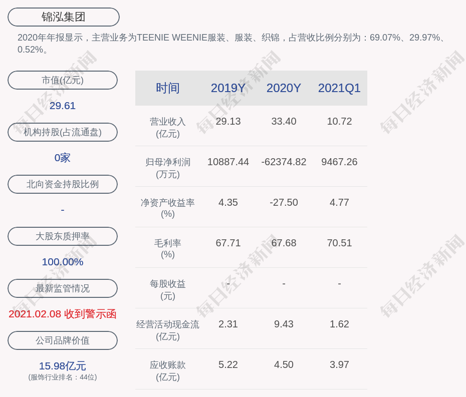 2020年年报显示,锦泓集团的主营业务为TEENIE WEENIE服装、服装、织锦,占营收比例分别为:69.07%、29.97%、0.52%。