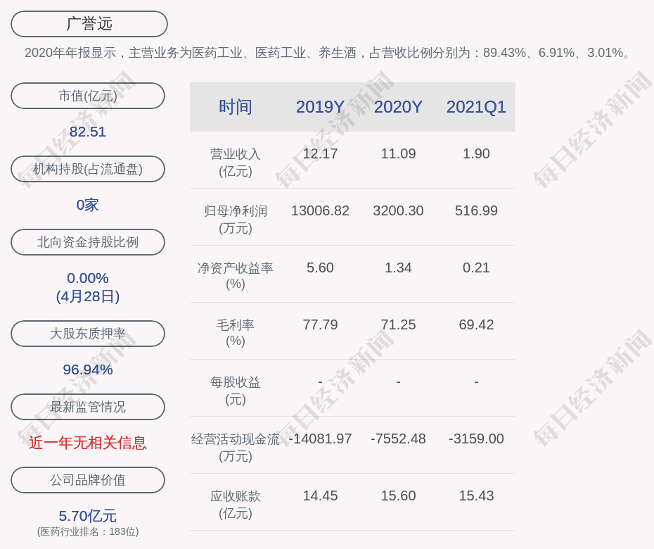 2020年年报显示,广誉远的主营业务为医药工业、医药工业、养生酒,占营收比例分别为:89.43%、6.91%、3.01%。