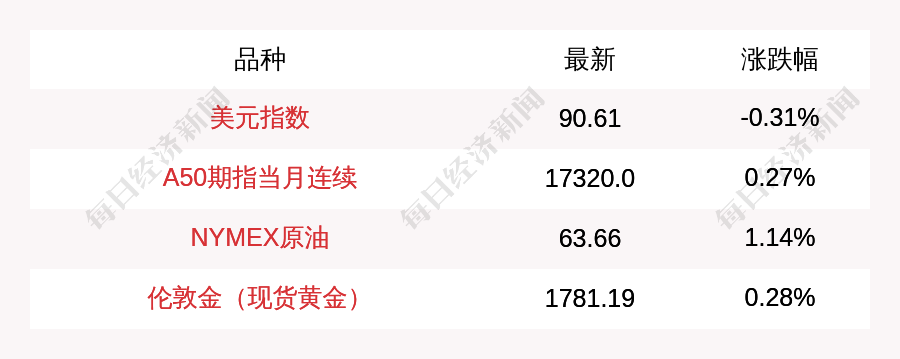 每经AI快讯:北京时间4月29日05:00,富时中国A50指数期货上涨47.0点,涨幅为0.27%,报17320.0点;NYMEX原油收盘上涨0.72点,涨幅为1.14%,报63.66点;美元指数收盘下跌0.28点,跌幅为0.31%,报90.61点;伦敦金(现货黄金)收盘上涨4.89点,涨幅为0.28%,报1781.19点。