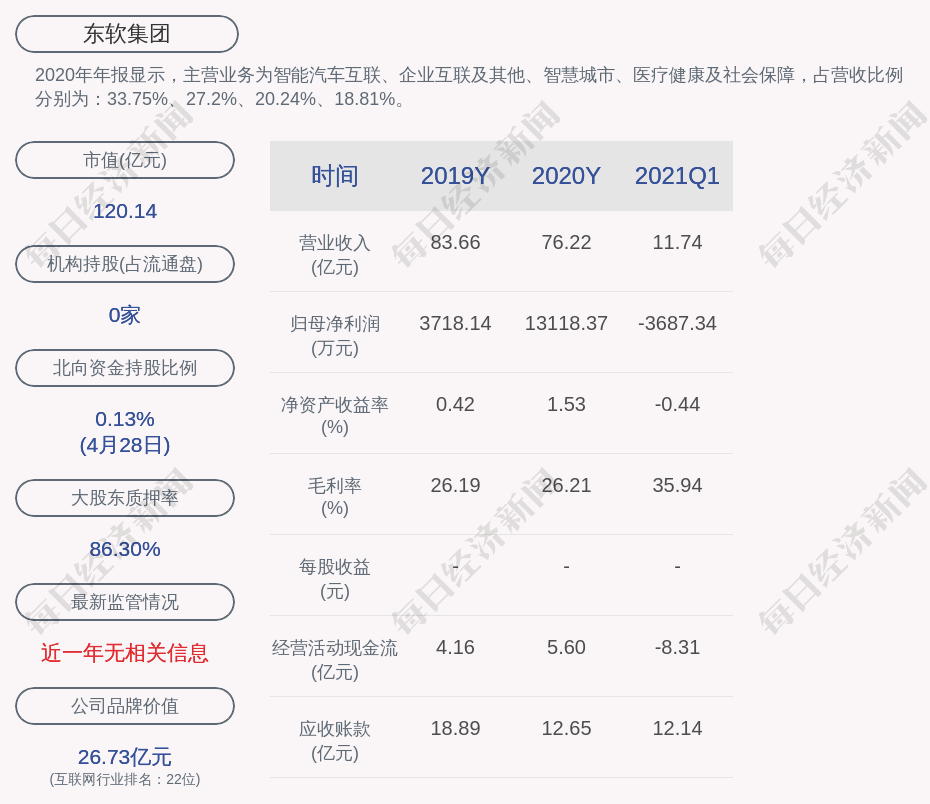 2020年年报显示,东软集团的主营业务为智能汽车互联、企业互联及其他、智慧城市、医疗健康及社会保障,占营收比例分别为:33.75%、27.2%、20.24%、18.81%。