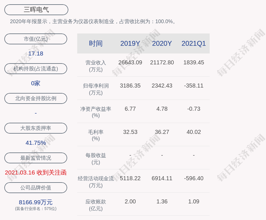 2020年年报显示,三晖电气的主营业务为仪器仪表制造业,占营收比例为:100.0%。