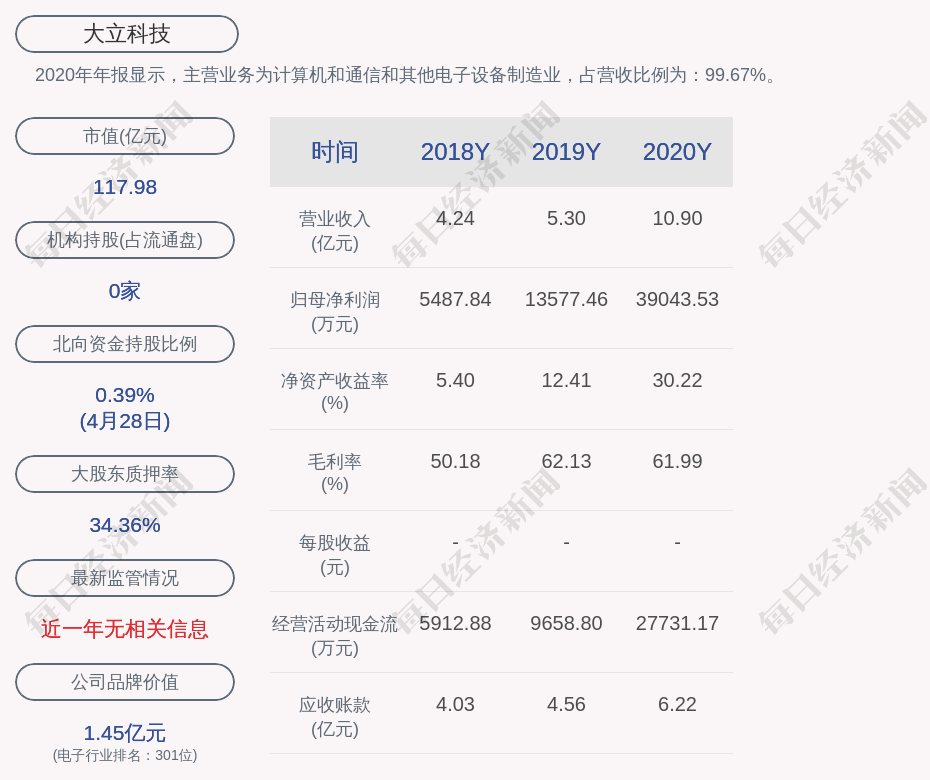 2020年年报显示,大立科技的主营业务为计算机和通信和其他电子设备制造业,占营收比例为:99.67%。