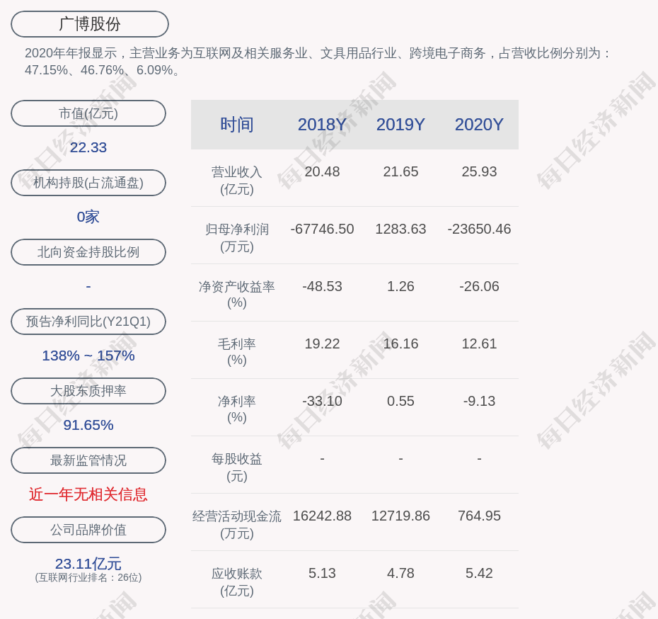 2020年年报显示,广博股份的主营业务为互联网及相关服务业、文具用品行业、跨境电子商务,占营收比例分别为:47.15%、46.76%、6.09%。