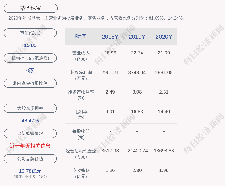 2020年年报显示,萃华珠宝的主营业务为批发业务、零售业务,占营收比例分别为:81.69%、14.24%。